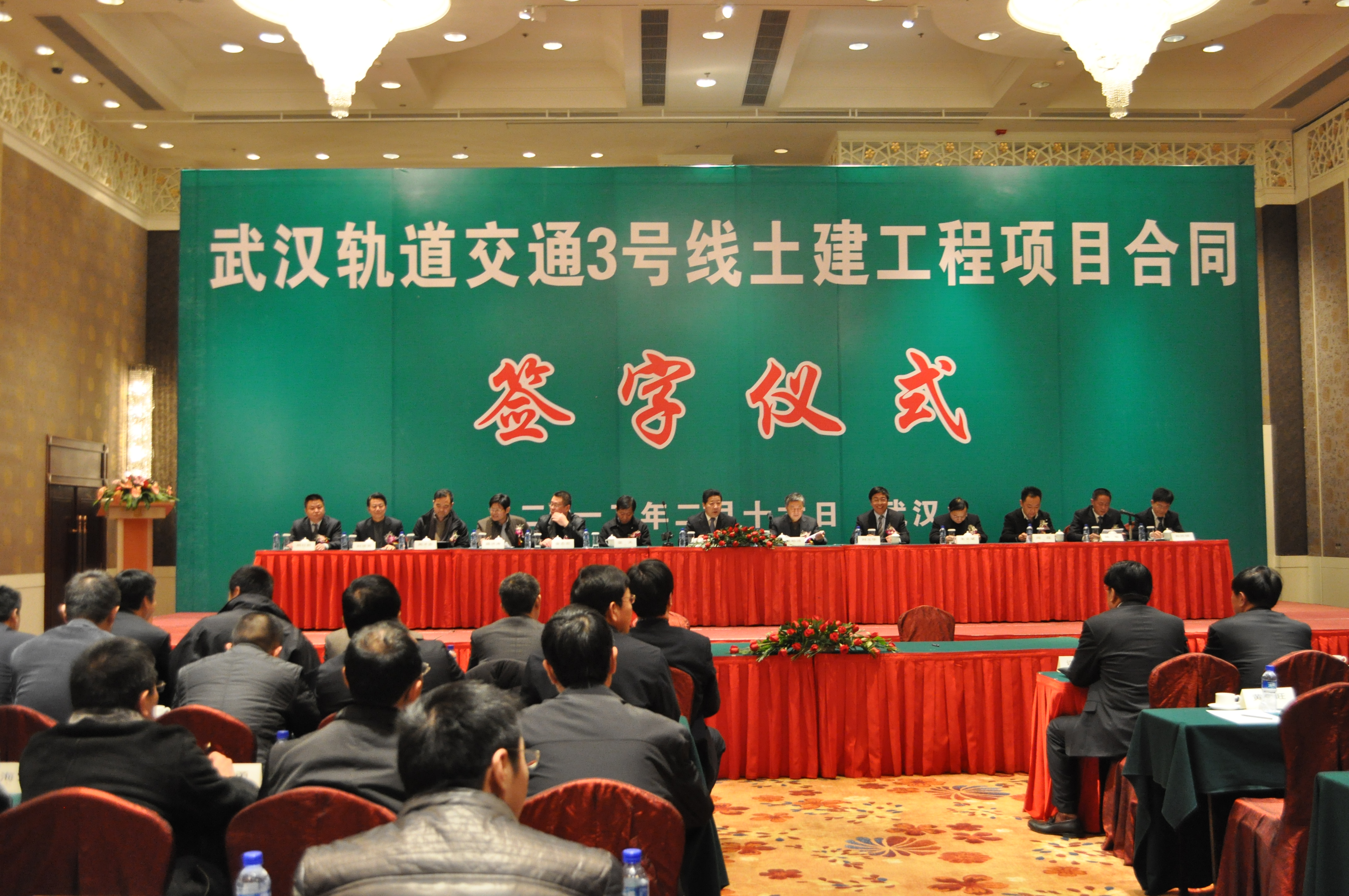 2012年2月16日下午,連通三金潭到沌陽大道的武漢軌道交通3號線一期土建工程項(xiàng)目合同簽字儀式在武漢香格里拉大酒店隆重舉行,標(biāo)志著武漢地鐵又一條線路進(jìn)入實(shí)質(zhì)性建設(shè)階段。武漢地鐵集團(tuán)總經(jīng)理劉玉華與14家中標(biāo)單位代表簽訂施工合同,武漢市發(fā)改委副主任熊貽沛、市相關(guān)部門領(lǐng)導(dǎo)、地鐵集團(tuán)董事長涂和平及其主要領(lǐng)導(dǎo)出席簽約儀式。