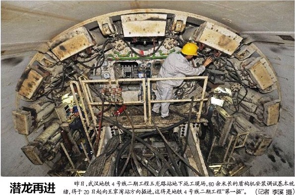 新聞圖片拍攝于鐘鑫公司玉龍路地鐵項(xiàng)目部地下施工現(xiàn)場,報(bào)道以“潛龍?jiān)龠M(jìn)”題,把漢陽市政一號(hào)盾構(gòu)機(jī)比作潛入地下的長龍,蓄勢待發(fā),在即將開始的盾構(gòu)掘進(jìn)施工中大顯身手。報(bào)道在文中指出,盾構(gòu)機(jī)調(diào)試工作基本就緒,將開始武漢地鐵4號(hào)線二期工程“第一掘”。