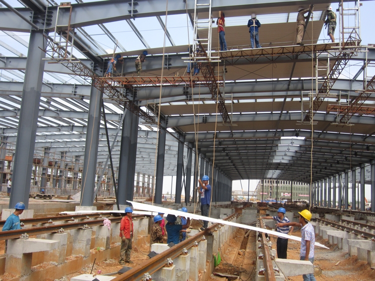 為確保施工節(jié)點工期,順利完成工程收尾攻堅階段,公司堅持緊密圍繞施工的各項指標(biāo),以“搶工期、保安全、保質(zhì)量、控造價”為目標(biāo),從嚴(yán)管理,強力推進(jìn),不遺余力的搶工期抓進(jìn)度。目前的工程重點是運用鋼結(jié)構(gòu)、土建工程以及三個門衛(wèi)房,至今形象進(jìn)度鋼結(jié)構(gòu)的鋼柱鋼梁已全部完成,檁條安裝完成80%,屋面安裝完成了40%。由于天氣炎熱,鋼構(gòu)件的溫度可謂是“燙手”,大大增加了白天安裝的難度;運用庫道床基礎(chǔ)基本完成,目前正在進(jìn)行附屬用房的砌體工程,與幾方的交叉作業(yè)是其施工難點;門衛(wèi)房是常規(guī)的鋼筋混凝土結(jié)構(gòu),但門衛(wèi)房一的一層含分部夾層,建筑高度為11.4m,建筑面積為313.26㎡;門衛(wèi)房二、門衛(wèi)三(一層)建筑高度為4.3m,建筑面積為48.64㎡,都屬于異形結(jié)構(gòu),施工難度系數(shù)較高。另外還有邊坡防護(hù)、圍墻等分部工程同時進(jìn)行。