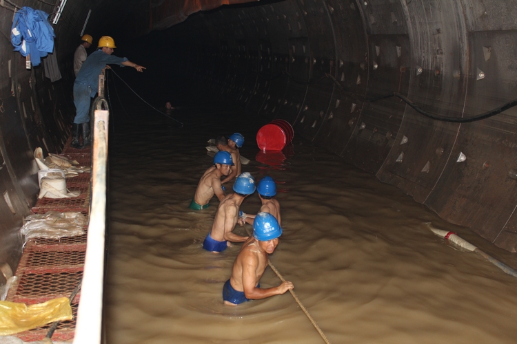 7月7日災(zāi)情發(fā)生后,玉龍路地鐵東段頭井基坑積水?dāng)?shù)米深,項(xiàng)目部立即投入排水搶修工作,集團(tuán)公司董事長(zhǎng)胡紅勝親自帶隊(duì)搶險(xiǎn),抽調(diào)十余臺(tái)大型抽水泵、25噸泵車到施工現(xiàn)場(chǎng),項(xiàng)目經(jīng)理及現(xiàn)場(chǎng)管理人員一人負(fù)責(zé)一臺(tái)抽水泵的拼裝,綁鐵絲、擰螺絲,自己動(dòng)手,公司總經(jīng)理王智高、支部書記王繁親自安排抽水泵下井工作,經(jīng)過(guò)三十多個(gè)工人三天的艱難搶險(xiǎn),終于將隧道中積水排出,一個(gè)星期后成功搶救出被淹沒(méi)的盾構(gòu)機(jī)。之后盾構(gòu)維修人員不畏艱難,跟泥土和水災(zāi)作戰(zhàn),將一個(gè)個(gè)零件拆下來(lái)進(jìn)行清洗檢修,公司還從海瑞克公司專門聘請(qǐng)兩名專職技術(shù)人員現(xiàn)場(chǎng)指導(dǎo)維修,電氣系統(tǒng)更換配件,重新調(diào)試,液壓系統(tǒng)也送到專業(yè)維修機(jī)構(gòu)進(jìn)行清洗維修,一個(gè)多月里解決了一個(gè)又一個(gè)難題,終于將盾構(gòu)機(jī)修好,具備再次始發(fā)的條件。