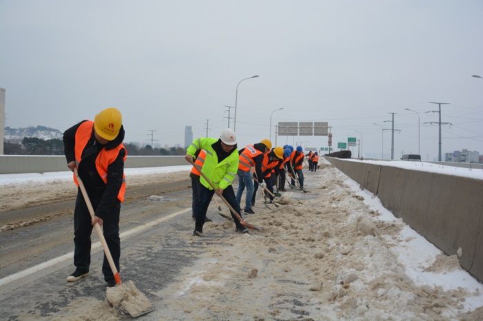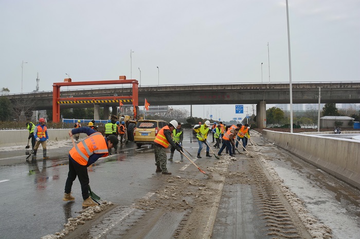時(shí)間來(lái)到28日上午8時(shí),在三環(huán)線百威路—長(zhǎng)豐橋路段,鐘鑫公司迅速調(diào)度六大項(xiàng)目部150人和鏟車(chē)、農(nóng)用車(chē)數(shù)臺(tái),集體前往三環(huán)線高架進(jìn)行除雪破冰。8點(diǎn)鐘的三環(huán)線高架,格外清冷,最低溫度甚至達(dá)到了零下6度!可是當(dāng)你置身于搶險(xiǎn)現(xiàn)場(chǎng)時(shí),卻完全感覺(jué)不到寒意——只因?yàn)榇蠹胰硇牡耐度氲綋岆U(xiǎn)工作中,一把把鐵鍬揮舞得那么有力,一條條產(chǎn)雪破冰后的路面是那么干凈整潔,現(xiàn)場(chǎng)氣氛是那么的熱烈。期間更是迎來(lái)了漢陽(yáng)區(qū)委書(shū)記馬澤江、漢陽(yáng)市政集團(tuán)公司董事長(zhǎng)嚴(yán)悌文等領(lǐng)導(dǎo)來(lái)到搶險(xiǎn)現(xiàn)場(chǎng)指揮工作,為正在搶險(xiǎn)的“鐵軍”們鼓勁加油,大家干勁更足了,精神更振奮,最終在下午13:30將三環(huán)線百威路—長(zhǎng)豐橋路段路面積雪清掃完畢。