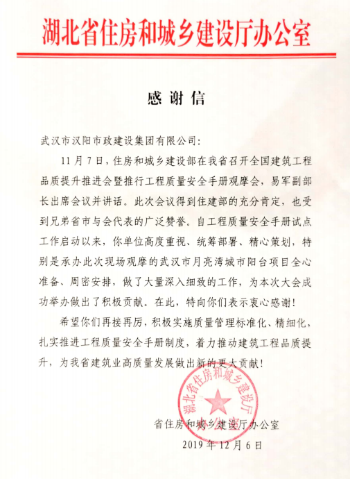 省住建廳在信中這樣說到“自工程質(zhì)量安全手冊試點(diǎn)工作啟動以來,你單位高度重視、統(tǒng)籌部署、精心策劃,特別是承辦此次現(xiàn)場觀摩的武漢市月亮灣城市陽臺項(xiàng)目全心準(zhǔn)備、周密安排,做了大量深入細(xì)致的工作,為本次大會成功舉辦做出了積極貢獻(xiàn),在此特想你們表示衷心感謝?!?/span>