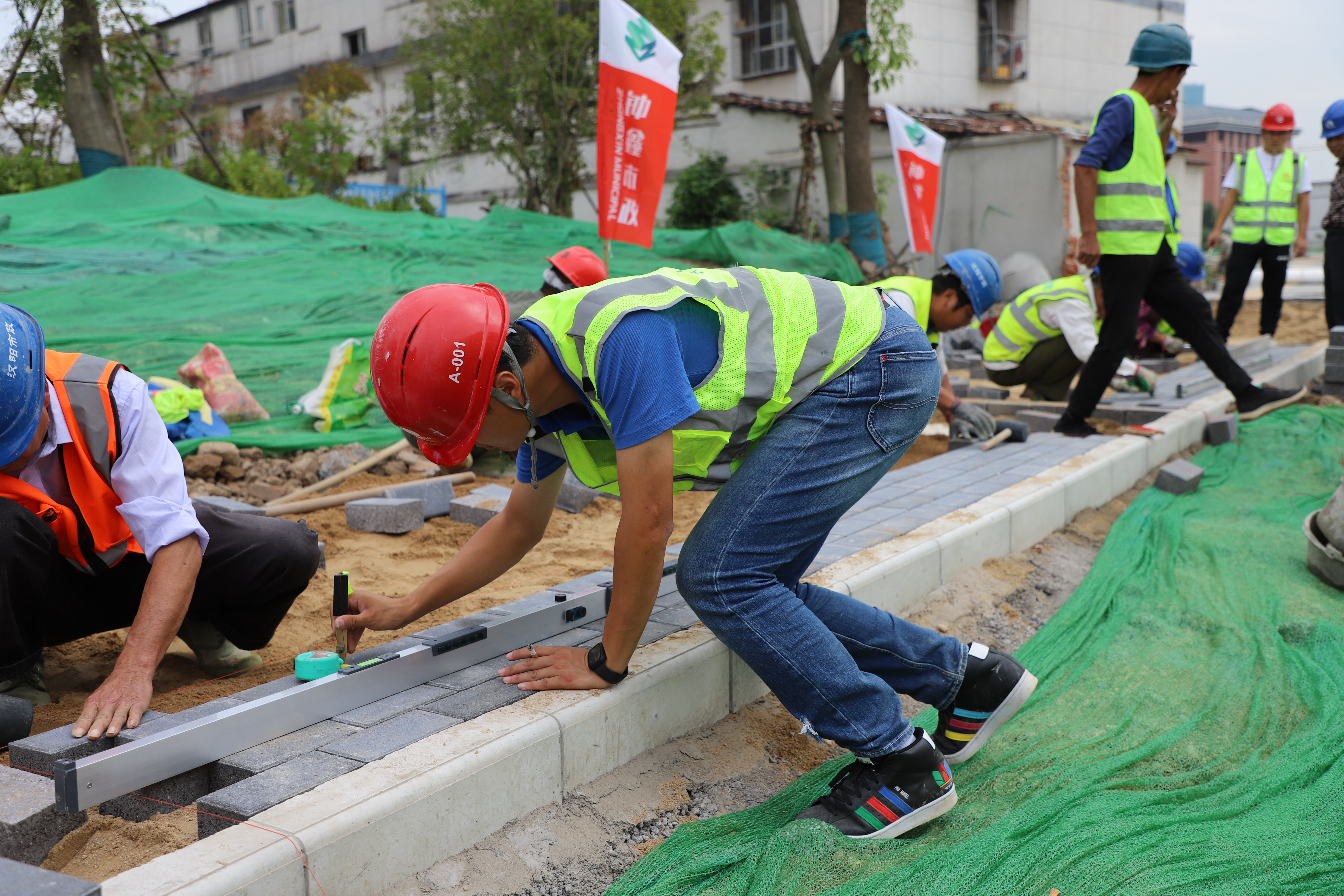 鐘鑫公司負責改造的漢陽區(qū)老舊小區(qū)(三期)改造項目新五里后堤小區(qū)現(xiàn)場彩旗隨風飛舞,各項目精選隊伍齊聚一堂,為取得人行道步磚鋪裝專項技能比武大賽的勝利做最后的準備。