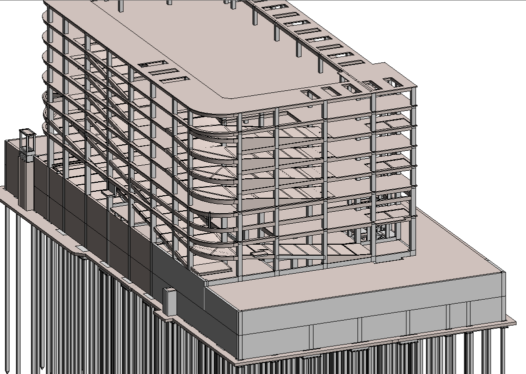 BIM技術提效率。面對停車樓從地下室至屋面的復雜的坡道結構,項目部積極采用BIM模型技術指導現(xiàn)場施工,用三維模型給工人技術交底,讓工人熟悉坡道的每一弧形梁與直梁的位置關系,更為精確地領會設計意圖,完全將圖紙吃透。